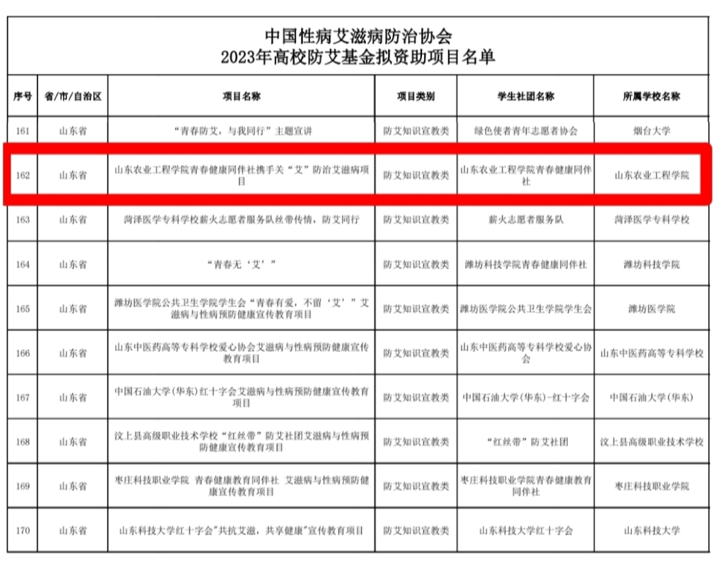 近日,中国性病艾滋病防治协会公布了2023年高校防艾基金申请项目入选名单,全国共有504个项目获得立项资助,由我院指导学生社团青春健康同伴社申报的携手关“艾”防治艾滋病项目,在防艾知识宣教类团队项目中脱颖而出,成功获批。