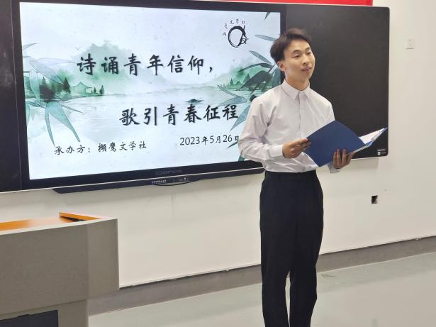青春,是燃烧的璀璨焰火,激扬着生命的风采;家国,是锦绣的万里河山,昂首于世界的东方。为深入学习贯彻党的二十大精神,增强青年大学生的社会责任感和使命感,营造浓厚的读书氛围,2023年5月26日撷鹰文学社在齐2教510智慧教室展开了一场精彩纷争的“诗诵青年信仰,歌引青春征程”朗诵比赛。