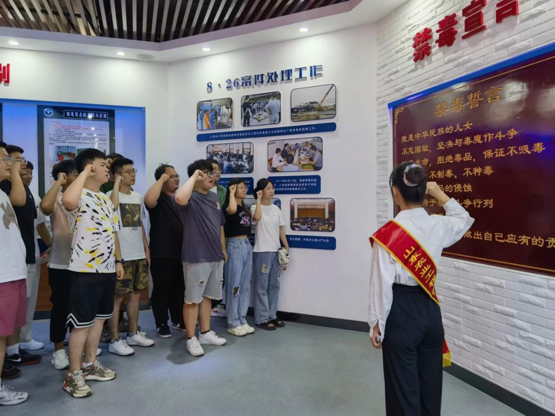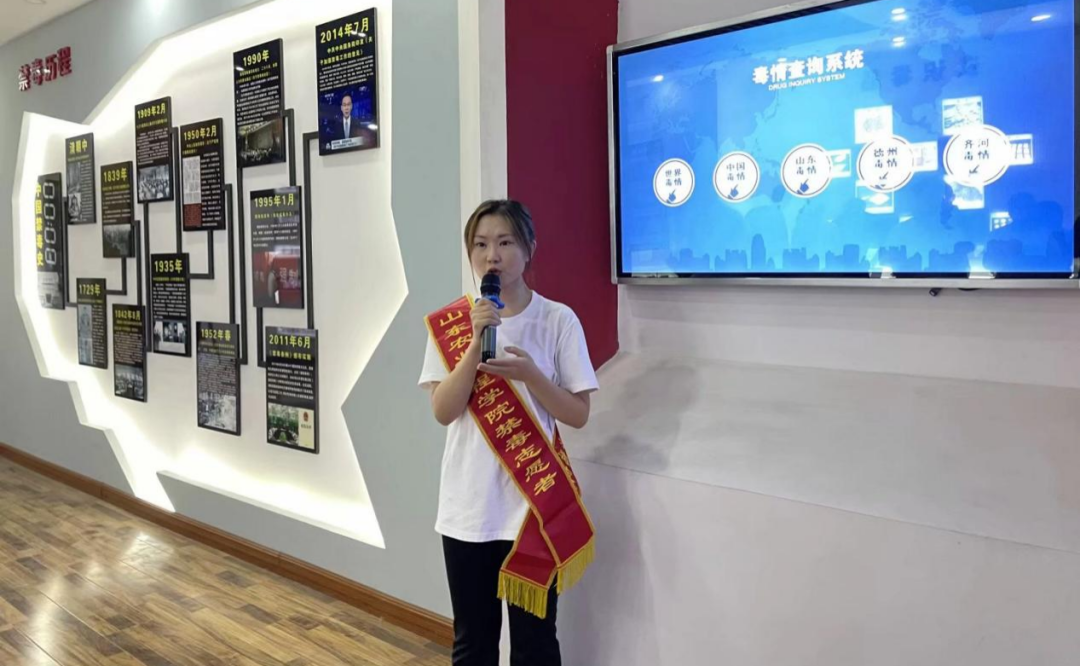 我院青春健康同伴社的学生禁毒志愿者们在齐河县禁毒教育基地,开展多场禁毒志愿讲解活动。志愿者向学生介绍了我国禁毒历史、毒品的种类、毒品的危害以及日常生活中应当如何预防毒品,讲解展厅内陈列的各类毒品模型、吸毒工具等,帮助学生体验“模拟吸毒人员驾驶汽车系统”“VR模拟吸毒场景”“吸毒后的你”等项目,带领学生集体进行禁毒宣誓,提醒大家在今后的生活中时刻保持警惕,远离毒品,向身边人宣传禁毒知识,牢固树立防毒禁毒意识,号召青年学子以实际行动共同参与到禁毒人民战争中来。