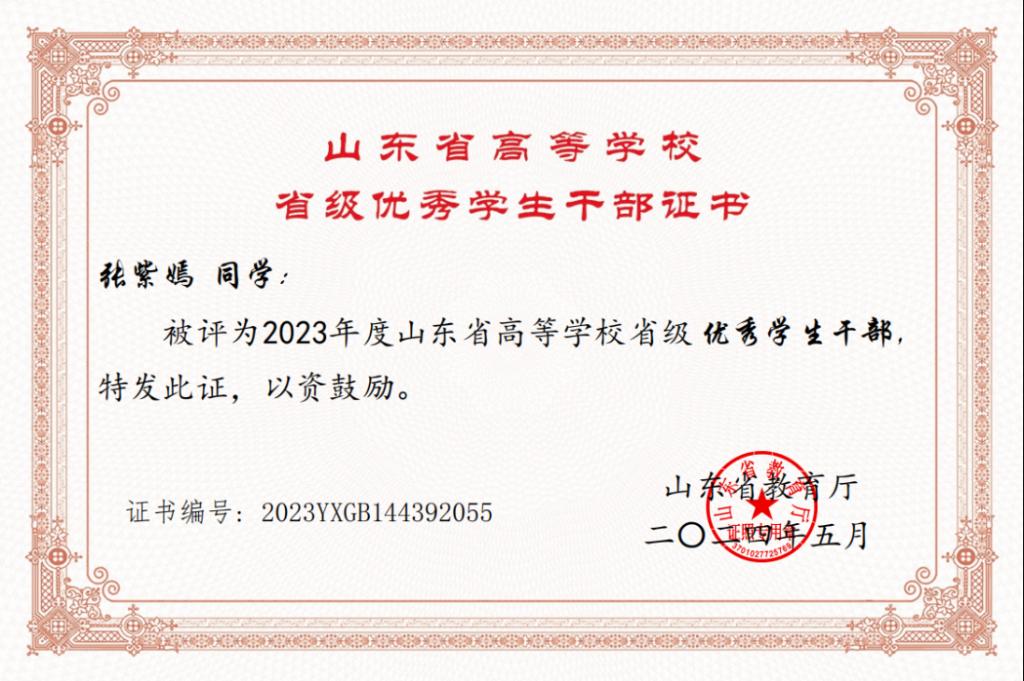 近日,2023年度山东省高等学校优秀学生干部、优秀学生评选落下帷幕,我院张紫嫣同学荣获“山东省高等学校优秀学生干部”称号,冯逸哲、任义冰两名同学荣获“山东省高等学校优秀学生”称号。