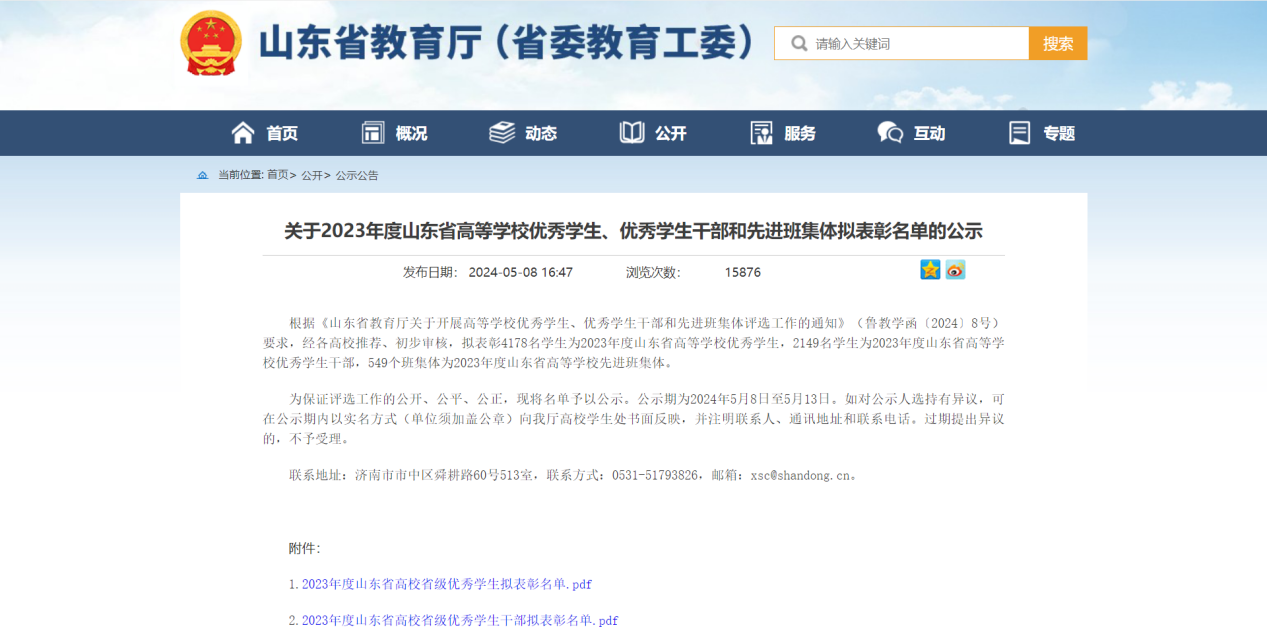 我院高度重视山东省高等学校优秀学生、优秀学生干部、先进班集体评选工作,将其作为落实学院学风建设、深化德育改革的重要载体。未来,我院也将继续做好先进典型的培育选树工作,充分发挥先进典型的引领示范作用,形成良好的价值导向和育人氛围,让更多的学子受到启迪、见诸行动,在新时代展现新作为、贡献新力量。