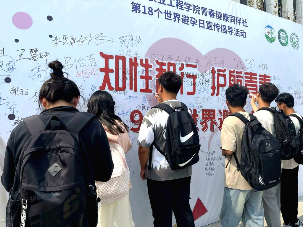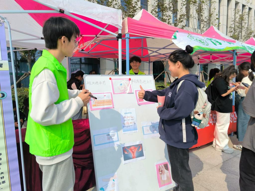 淄博校区图书馆广场前,青春健康同伴社志愿者通过答题闯关、知识宣讲、发放宣传折页、线上知识竞答等形式开展宣传倡导活动,向学生普及健康知识。活动现场氛围热烈,学生们踊跃参与并在签名板上签名留念。
