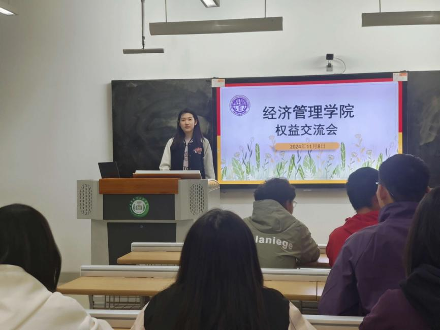 2024年11月8日,经济管理学院在淄博校区文法西楼A312教室召开“烛光虽小,愿散其亮”权益保障交流会,本次会议出席人员有院学生会权益监察部成员、2024级各班班长和权益保障委员。