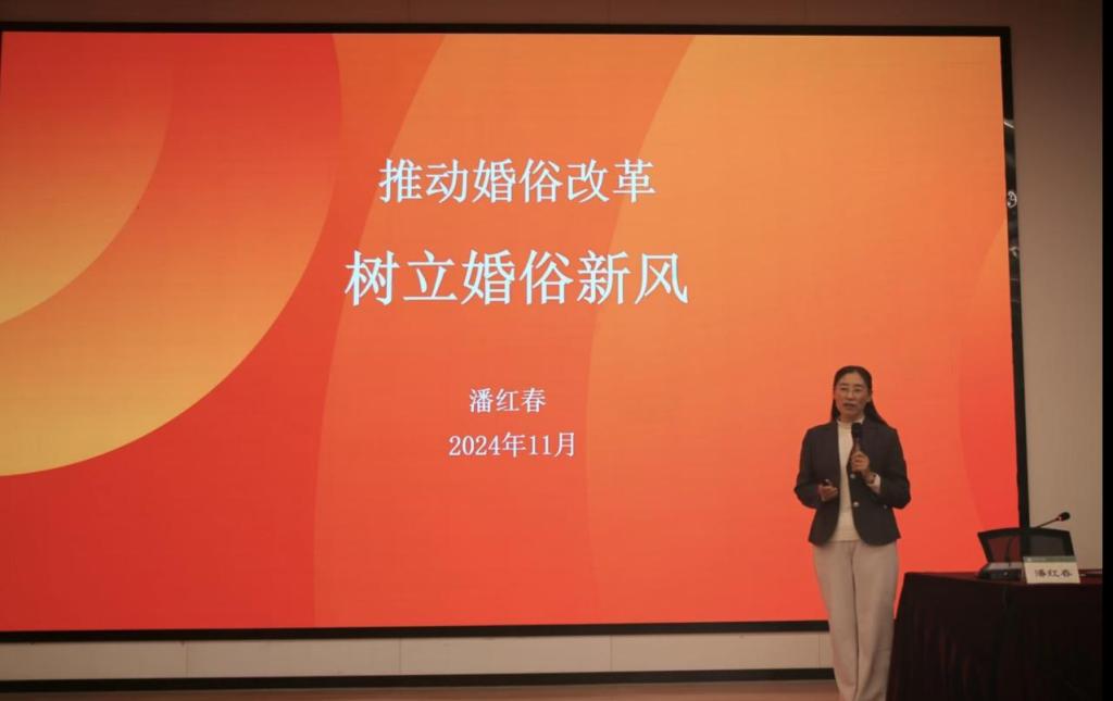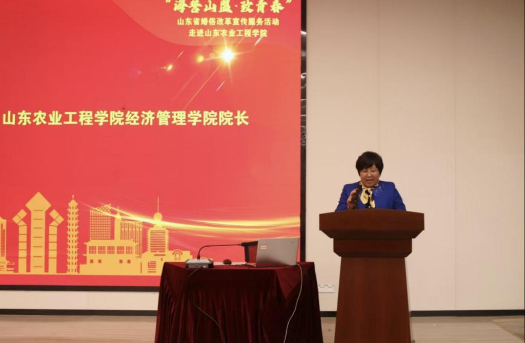 活动伊始,经济管理学院院长李百秀发表了致辞,向与会人员介绍了学院的基本情况,对活动的举办表示热烈的祝贺,并强调了新型婚育文化对于社会文明进步的重要意义。李百秀院长表示:“婚俗改革是社会进步的体现,做好青年婚恋工作,不仅直接影响着青年学生的健康发展,也关系到社会的和谐稳定,关注大学生婚育观的培育是高校义不容辞的责任。希望同学们大力践行积极的婚恋观、家庭观、生育观,自觉成为新时代婚育文化的推动者、实践者、宣传者”。随后,省企业管理研究会常务秘书长孙亮对全省婚俗改革宣传服务项目进行了详细的介绍和规划,为与会师生描绘了一幅婚俗改革的美好蓝图。