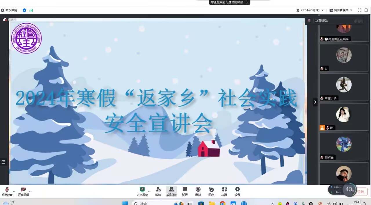 为引领经管学子深入基层一线、洞悉国家发展现状、全心全意服务人民群众,将课堂所学理论知识与社会实践深度融合,以实际行动投身于乡村振兴战略的伟大实践之中,经济管理学院于2024年1月17日举办2024年寒假“返家乡”社会实践线上安全宣讲会。