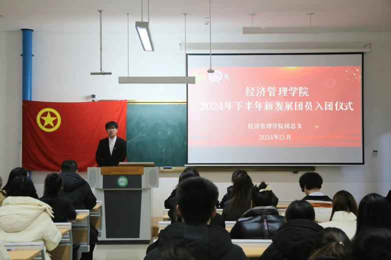 为进一步团结广大团员和青年,坚定理想信念,增强团员责任感和使命感,2024年12月17日,经济管理学院于文法西楼B105教室举行2024年下半年新发展团员入团仪式,我院思想政治辅导员李娜、侯沁菲以及2024年下半年全体新发展团员参与此次仪式。