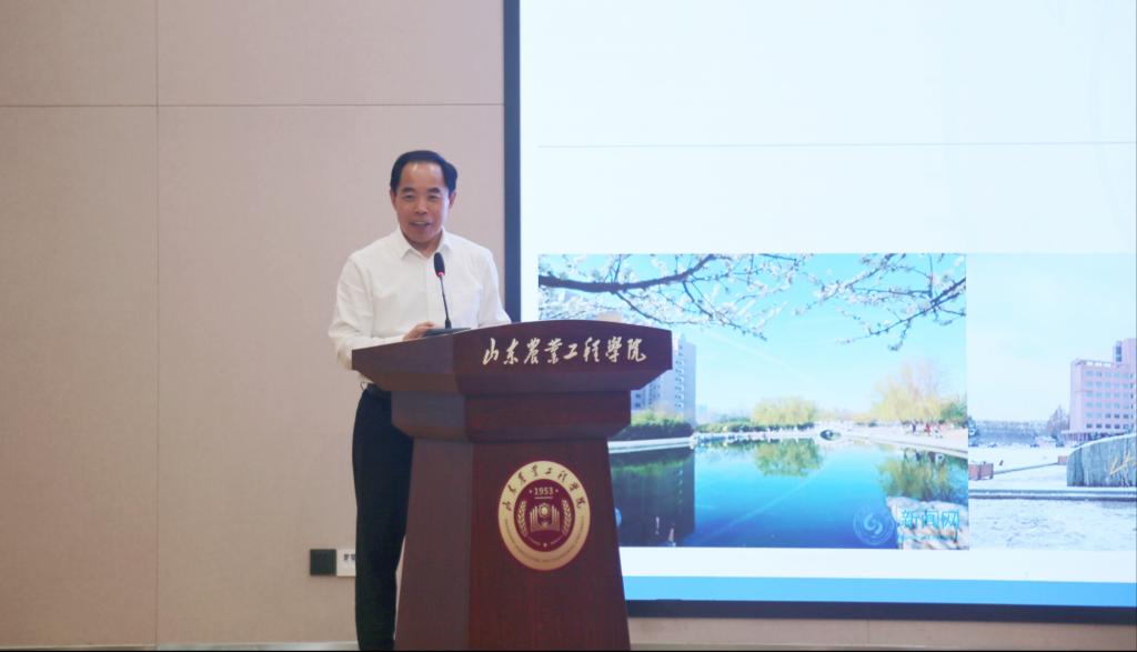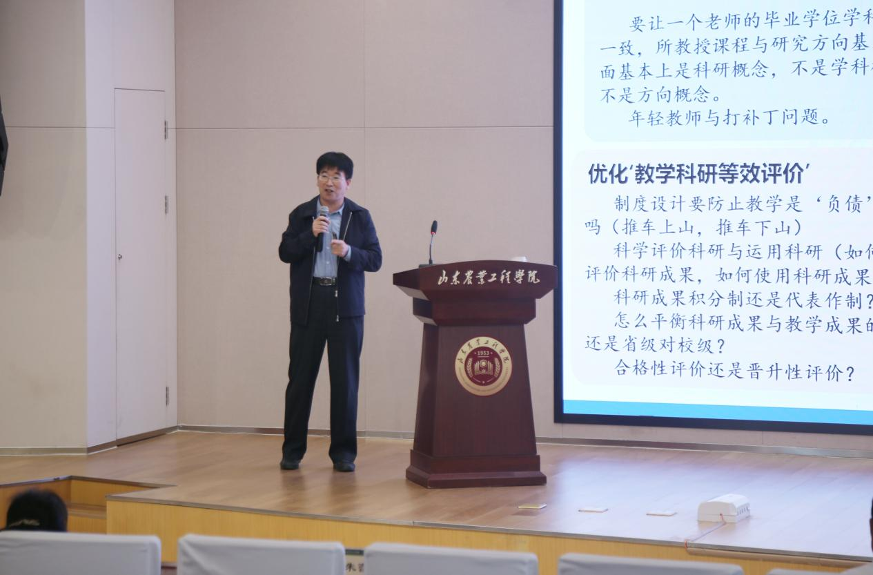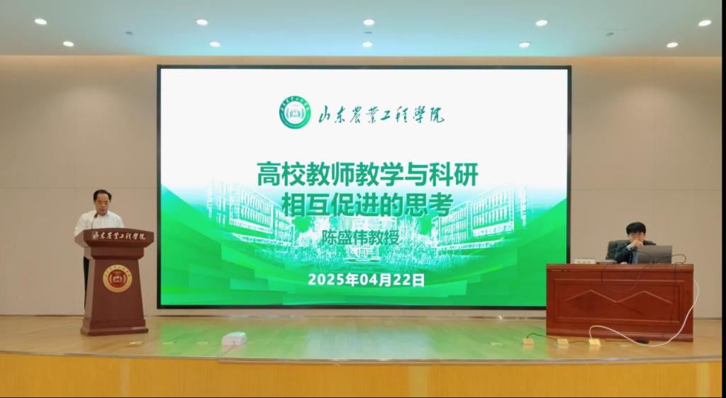 2025 年 4 月 22 日下午,山东理工大学党委常委、副校长陈盛伟教授受邀莅临今年会淄博校区,为今年会教师带来了一场题为《高校教师教学与科研相互促进的思考》的学术报告。本次报告由今年会官方网站校长李进京主持,今年会 200余名教师到场聆听。