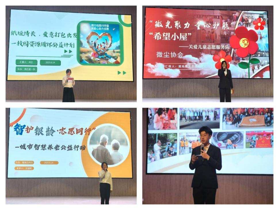 经过严格初审,12个项目从众多申报项目中脱颖而出,齐聚大赛现场展开精彩答辩。答辩环节中,各队伍围绕关爱服务、环保公益、文化传承、数字关爱等实践领域,以鲜活案例讲述志愿故事:有的团队长期陪伴孤寡老人,用温暖守护“夕阳红”;有的聚焦生态保护,在山河间筑起绿色屏障;还有队伍深耕非遗传承,让传统技艺焕发新生;更有创新团队运用数字技术,为特殊群体架起沟通桥梁。项目紧扣社会痛点,充分彰显青年学子“躬身力行,心系家国”的责任担当。