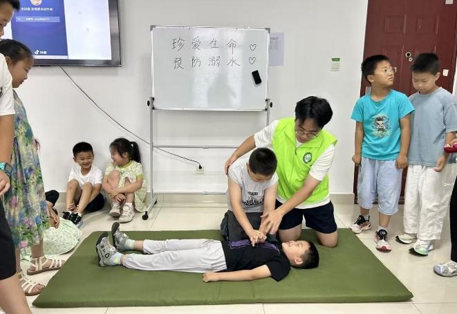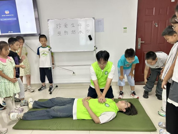 志愿者通过图文并茂的PPT 展示、精彩的动画视频以及互动问答的形式,为小朋友们详细讲解了溺水的危害、常见的溺水原因以及如何预防溺水等相关知识,着重强调了“六不准”原则。在实践环节,志愿者现场展示心肺复苏的步骤,还模拟了溺水场景,让孩子们亲身体验如何在危险情况下进行自救和求救,并强调:“每一次按压都可能挽救一条生命”。