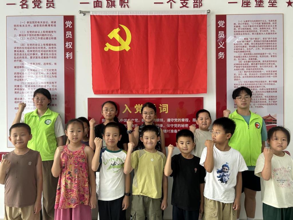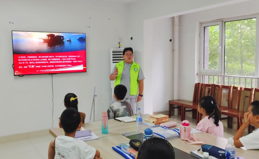 志愿服务期间,团队面向广饶县社区儿童开展沉浸式红色文化教育,通过集体观看爱国主义影片,让历史的厚重与光辉在眼前生动再现,激发出“童心向党”的理想信念。两名学生党员用朴素的语言开启历史课堂,讲述抗日战争时期、社会主义建设初期等不同历史阶段的先锋党员事迹,带领孩子们齐声高唱《没有共产党,就没有新中国》,鼓励孩子们上台分享自己喜爱的红色故事,把对祖国的满腔爱意全都灌注于歌声中。以创新教育形式为抓手,将红色精神融入社区服务中,为青少年成长注入青春动能。