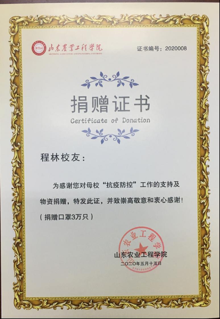 程琳校友热心公益事业,时刻关心母校的发展,2020年5月15日程琳、曹勇、齐岭、张克君、车珂和崔红润等校友在学校即将复学之际,代表经管学院校友向母校捐赠一次性医用口罩30000只,用于新冠肺炎疫情防控,助力师生返校复学。他们的善举表达了校友们对母校的拳拳之情,体现了校友企业强烈的社会责任感和使命感。
