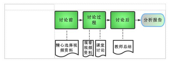 课堂讨论的过程是讨论前教师准备课堂讨论的素材(一般是视频资料),课堂上首先学生观看视频资料,然后根据视频资料展开讨论;课下学生根据课堂讨论的结果,搜集相关资料,写出课堂讨论总结报告。具体流程见图 1。根据近几年的课程教学情况,讨论课的各环节注意事项总结如下: