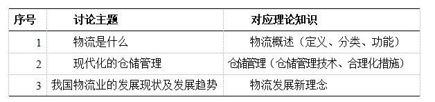 课堂讨论可以加深学生对理论知识的理解,有助于启发学生独立思考,相互交流意见,培养他们独立分析问题、解决问题的能力和训练口头表达能力。教师根据教学目的确定讨论的题目并提出具体要求,精心搜集资料,一般是视频资料, 认真准备意见和写出发言提纲。讨论进行时,充分启发学生的独立思考,鼓励他们各抒己见,引导他们逐步深入到问题的实质并就分歧的意见进行辩论,培养实事求是的精神和创造性地解决问题的能力。讨论结束时,教师作出总结,也可提出进一步思考和研究的问题。根据现代物流学课程知识的特点,任课教师确定了三个讨论主题,见表1。