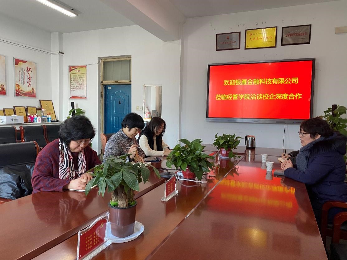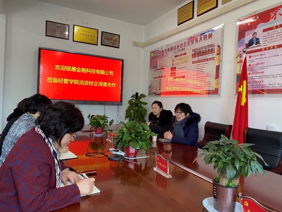 1月12日上午,经管学院邀请银雁科技集团山东分公司人力资源总经理张新颖和人力资源专员刘俊一行就毕业生实习事宜进行交流。经管学院党总支书记颜素杰、院长李百秀和副院长曲文俏参加了座谈会。会议由颜素杰书记主持。