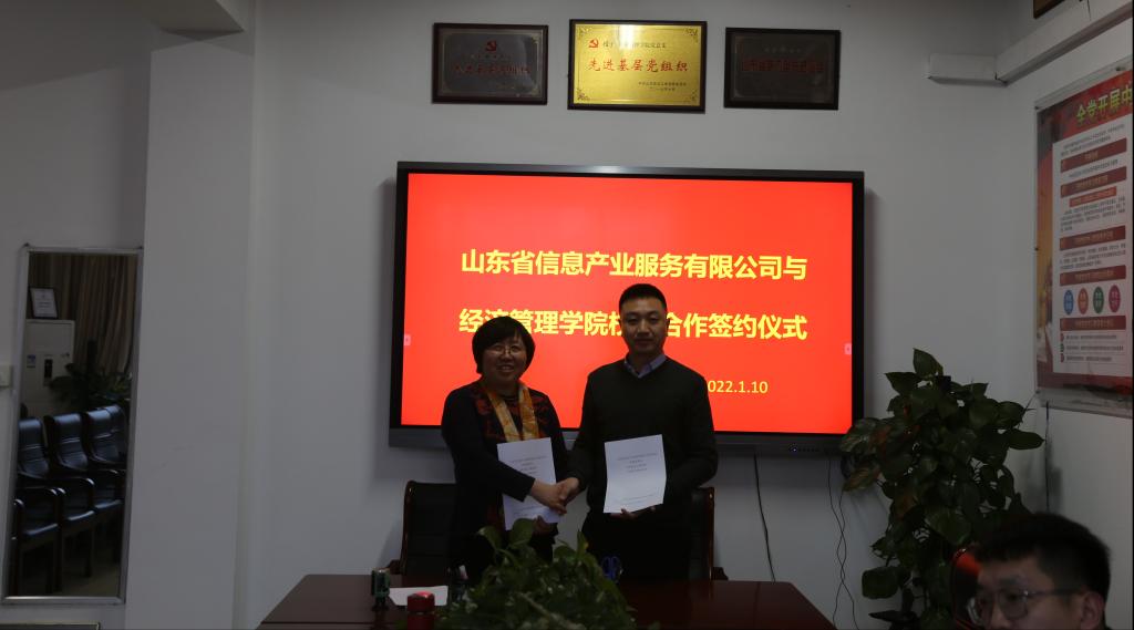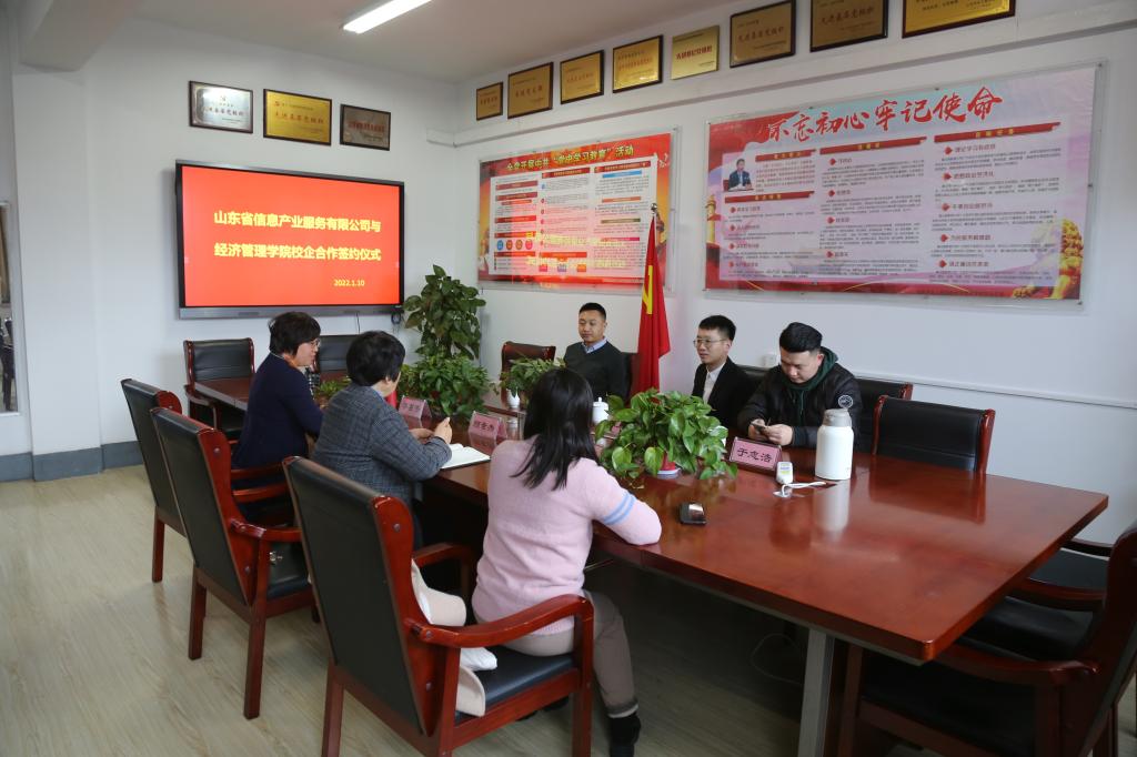 2022年1月10日下午,在济南校区1号教学楼311党建活动室经济管理学院与山东省信息产业服务有限公司签订了产学研合作协议及就业实践基地合作协议。企业方的王韬、廉晋辉、于志浩三位经理,经管学院院长李百秀、党总支书记颜素杰、物流教研室主任陈岱莲及部分教师代表参加了签约仪式。