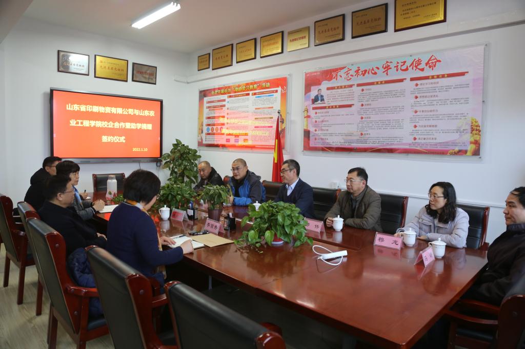 2022年1月10日上午,在济南校区1号教学楼311党建活动室经济管理学院与山东印刷物资有限公司签订校企合作暨捐赠协议。学校党委委员、副校长杨振宁莅临会议现场,企业方总经理沈铁携郭伟、李宁、穆龙、杨波和马涛一行六人参会,学院党总支书记颜素杰、院长李百秀、副书记杜锋及部分教师代表参加了签约仪式。