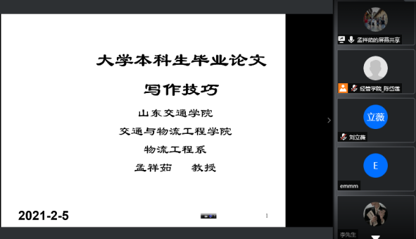 2月5日下午,经纬讲坛第五十三讲“大学本科毕业论文写作技巧”通过腾讯会议形式开讲,由山东交通学院孟祥茹教授主讲。讲座由物流教研室主任陈岱莲主持,经管学院全体教师、2021届本科毕业生及部分2018级本科生共340多人聆听了讲座。