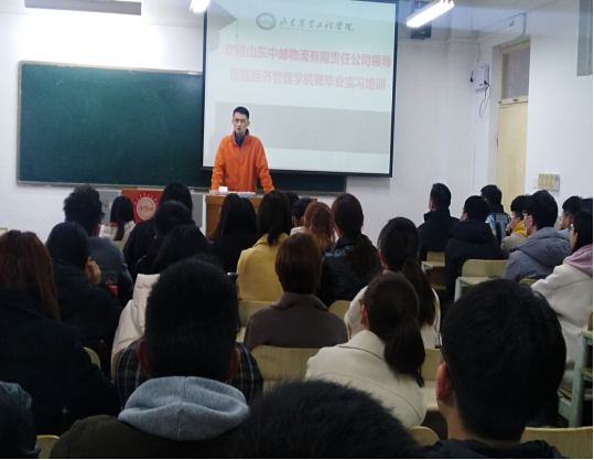 中邮物流有限责任公司曹洪波经理和综合部黄文静经理分别从职业生涯、岗位分配及实习内容等方面向同学们作了介绍与引导。