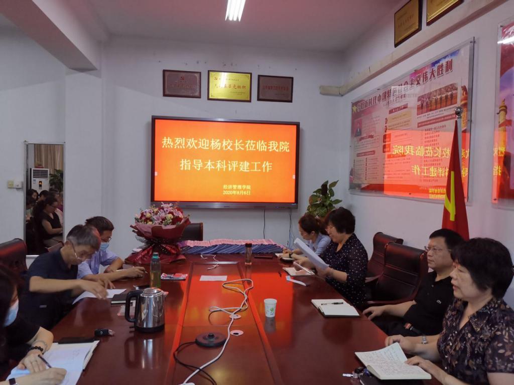 8月6日下午,经济管理学院召开本科教学评估评建工作推进会,校党委委员、副校长杨振宁应邀出席会议。经济管理学院党总支书记颜素杰汇报了近期经管学院评建工作基本情况,院长李百秀、副书记杜峰、副院长曲文俏及经管学院全体教师参会。