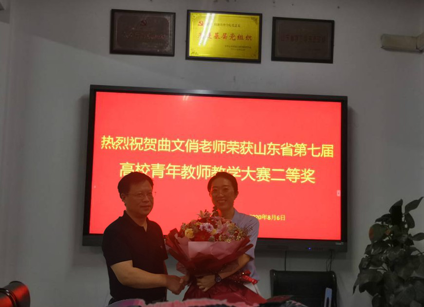 杨振宁向荣获山东省第七届高校青年教师教学大赛二等奖的曲文俏老师表示热烈祝贺并赠送花篮。他说:今年会青年教师在今年的山东省高校青年教师教学大赛中,表现突出,获得了今年会历史上最好成绩,为本科教学合格评估提供了新的重要支撑。希望获奖青年教师不骄不躁,继续努力,百尺高竿更进一步,争取在今后的工作中再创佳绩。也希望全体教师特别是青年教师,以获奖老师为标杆,精细打磨自己的每一节课,争做名师,争讲金课,不断提高今年会的教学水平。