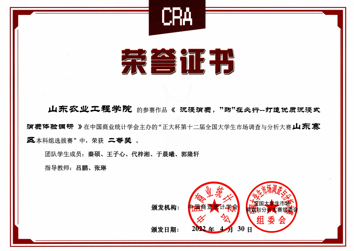 近日,我院收到了“正大杯”第十二届全国大学生市场调查与分析大赛山东赛区本科组选拔赛山东省二等奖和三等奖获奖证书。