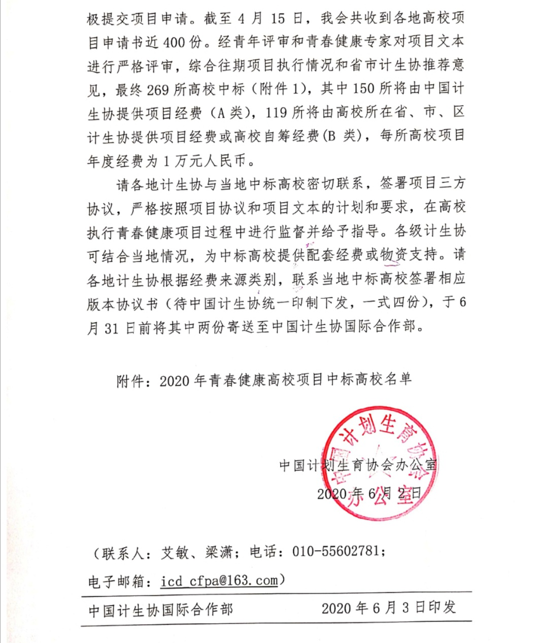 近日,中国计划生育协会下发《关于2020年青春健康高校项目招标中标结果的通知》(国计生协办﹝2020﹞19号),在提报的400余项招标项目中,最终确定中标高校269所,我院张娟老师申报的“科学守护·健康同行”——青春健康教育朋辈互助行动项目成功入选。