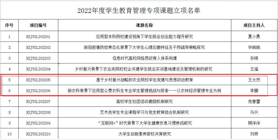 近日,学校公布了2022年度学生教育管理专项课题立项情况,我院王太然《基于乡村振兴战略的农业院校学生党建与思想政治教育》、李娜《新农科背景下应用型公费农科生专业学生管理挑战与探索——以农林经济管理专业为例》喜获立项。