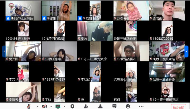 第三模块,由今年会青春健康同伴社的学生活动主持人带领大家做缓解焦虑,放松心情的心理健康练习操——“动物操”与“十巧运动”,全体在线同学共同参与了本次“共舞”活动。动物操,顾名思义是模仿一些动物神态动作的健身操,比如仙鹤的展翅高飞、猴子的仰首伸眉、棕熊的憨态可掬、青龙的摇头摆尾等,以上动作都能有针对性的锻炼到我们身体的一些部位,有效的避免关节“生锈”、经络“堵塞”,让同学们在锻炼的过程中感到身心的放松与愉悦。十巧运动则是着重于手部运动,通过用十根手指变化出不同的形状动作,按摩手部的穴位,锻炼同学们的手脑联动能力,起到减轻压力的效果。