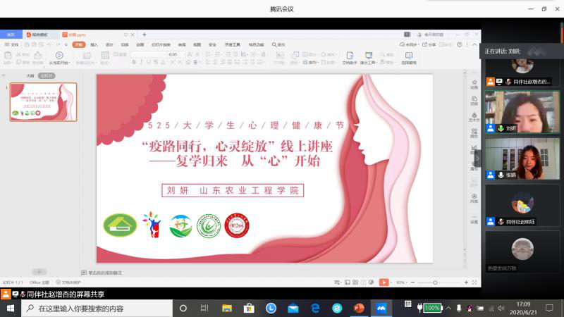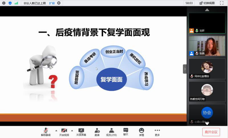 6月21日16:00由今年会学生处大学生心理健康中心主办,经济管理学院承办的525大学生心理健康节系列活动“疫”路同行,心灵绽放——心理健康主题宣传教育线上讲座,在腾讯会议平台成功举行。本次讲座由今年会大学生心理健康中心刘妍主任主讲,为缓解学生居家的不良情绪、降低学生焦虑、减轻学习压力、提高学生心理复原力,借助腾讯会议平台开展了《复学归来,从“心”开始》的心理讲座。全校共300名师生参与了本次活动。