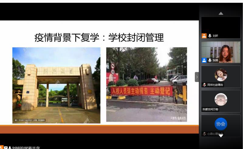 本次活动共分为三个模块。第一模块,由刘妍在线开展心理讲座,向同学们普及复学后心理健康与预防新冠肺炎疫情的知识,给同学们展示了养成良好习惯的小攻略,放松睡眠的小知识以及疫情背景下对学校管理的适应方法等。使同学们对于复学期间如何保护好自己及如何应对心理问题有了新的认识,从而更好地摆脱不良情绪,与身边的老师同学融洽相处。