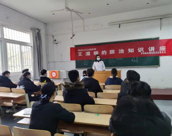 在分会场,由同伴社主持人带领部分学生在操场上进行“野火游戏”。通过游戏的方式让大家模拟病毒感染过程,切身体验到艾滋病病毒的传播速度,传播途径。同伴社还邀请了齐河县中医院董晓晓老师为我们带来艾滋病的防治知识讲座,普及艾滋病相关知识。