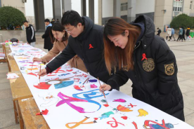 12月1日,由校团委主办,经济管理学院青春健康同伴社承办的“携手防疫抗艾,共担健康责任”世界艾滋病日主题活动在北校区二号教学楼前举办。校团委夏百惠、学生处魏建峰、卫生所王轩老师、齐河中医院董晓晓老师以及社团指导教师张娟来到现场参与活动。
