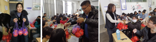 老师们和学生会干部为每一位考研学子送上学院准备的考研礼包,两颗金橙象征“心想事‘橙’”;一支笔象征“金榜题名”。