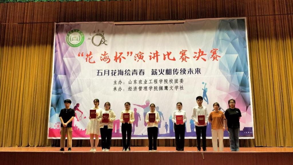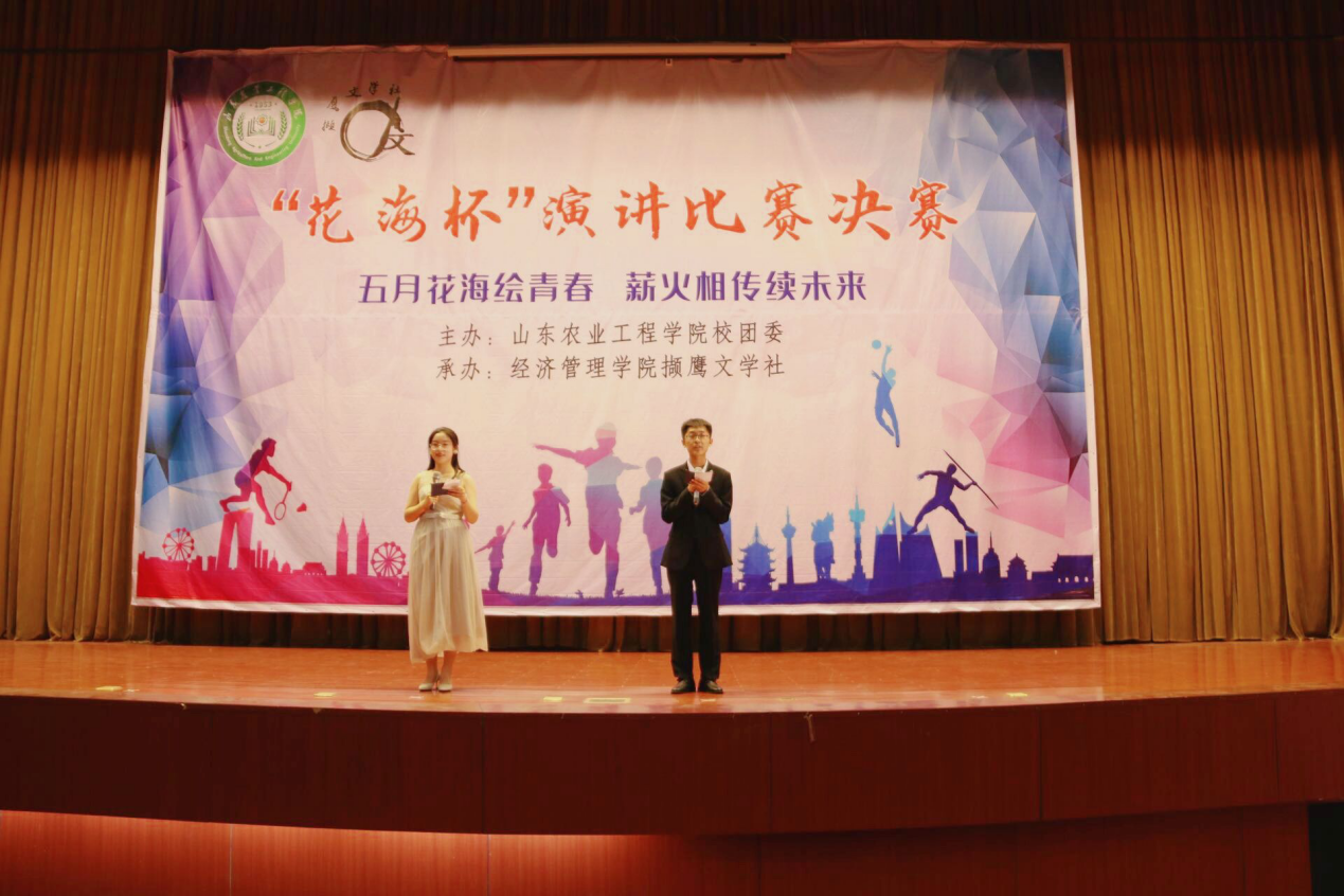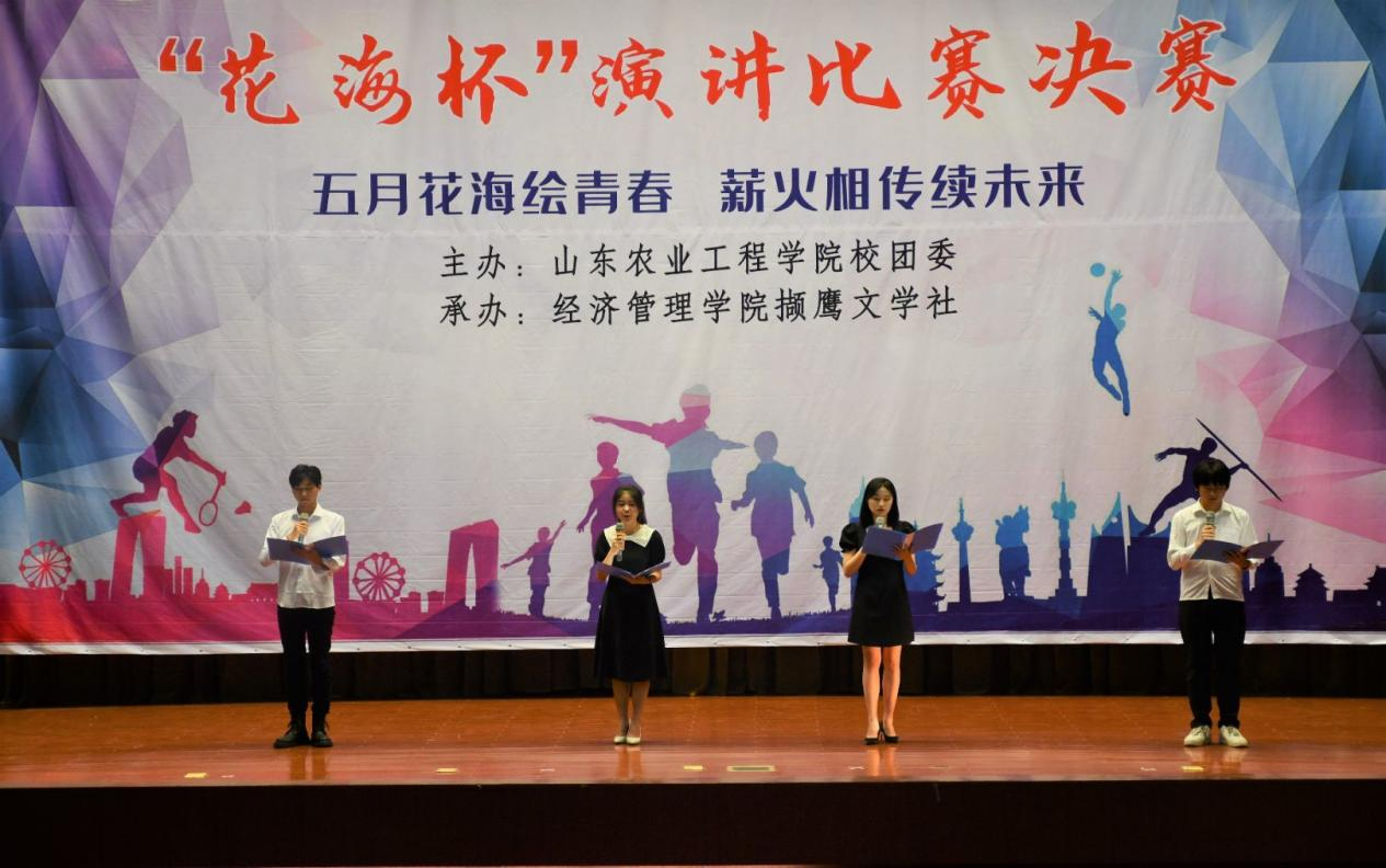 5月21日,由校团委主办、经济管理学院撷鹰文学社承办的 “花海杯”演讲比赛决赛在齐河校区学术报告厅成功举办。撷鹰文学社指导教师李娜、商学院辅导员蒋杰锐、校团委学生副书记高雨洁、校社团联合会主席金钰、撷鹰文学社社长车贵宇担任此次演讲比赛评委。