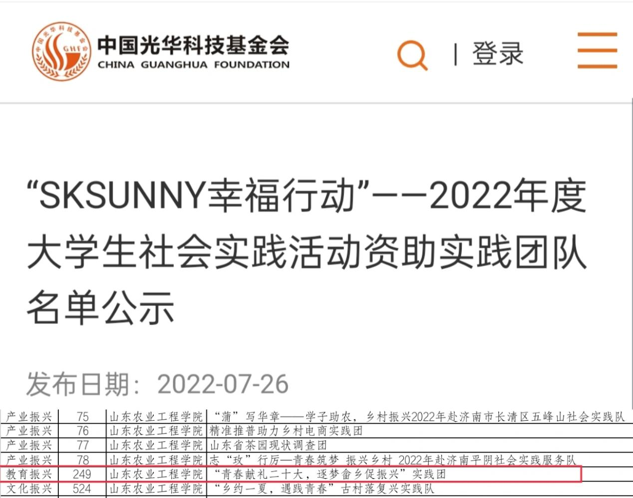7月26日,由中国光华科技基金会主办的“SKSUNNY幸福行动”大学生社会实践专项活动发布了入选高校团队名单,由我院张娟老师指导的“青春献礼二十大·逐梦畲乡促振兴”实践团在来自全国高校的656支实践团中脱颖而出,成功获批。