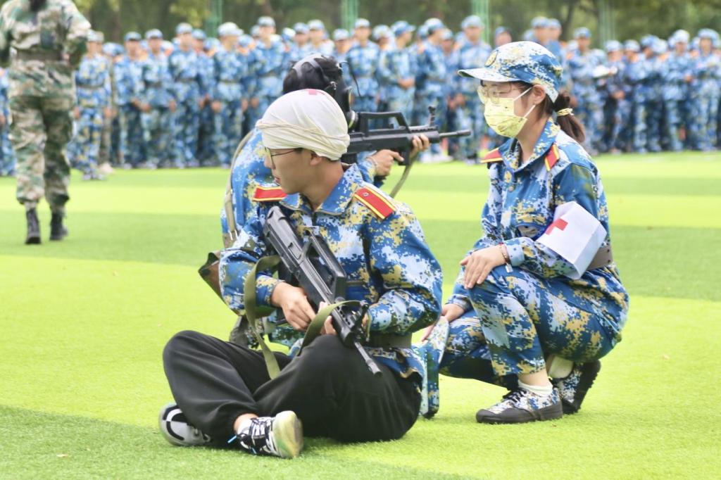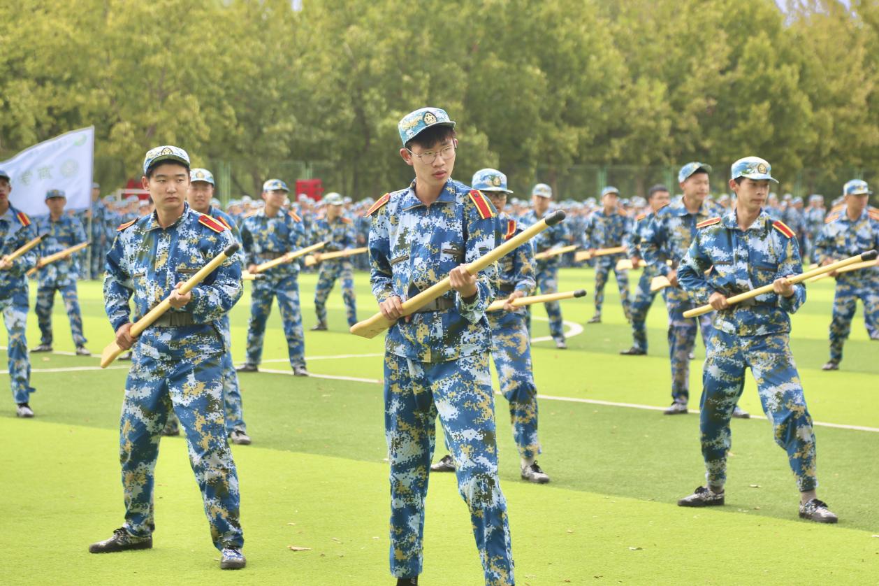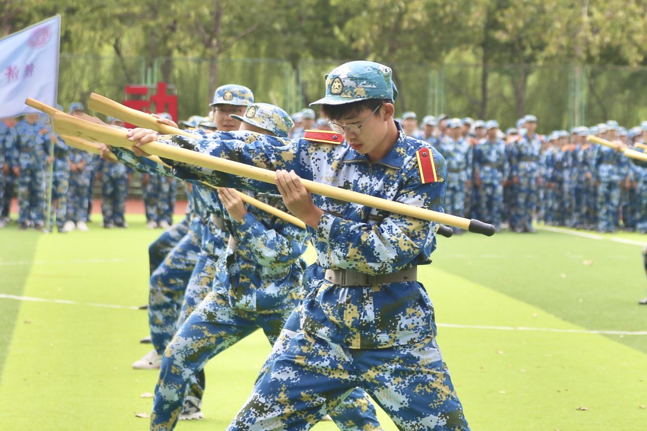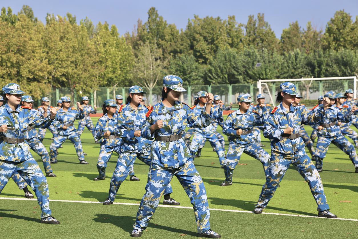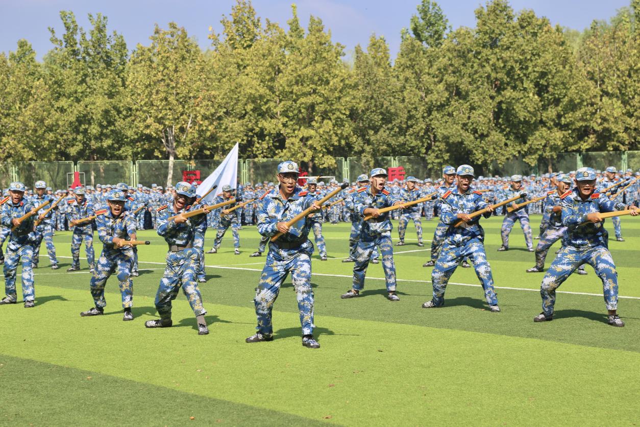我院学子在特色方队中表现优异,眼神坚毅、严阵以待,一招一式尽显蓬勃朝气,完美地进行了军体拳、刺杀操与战术综合的演练。