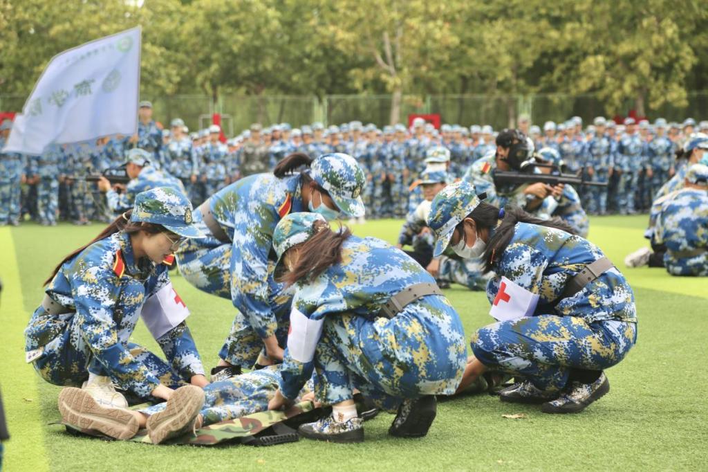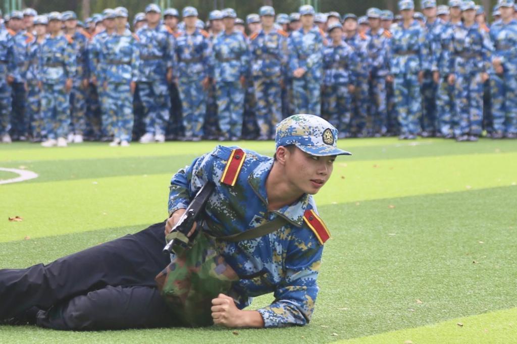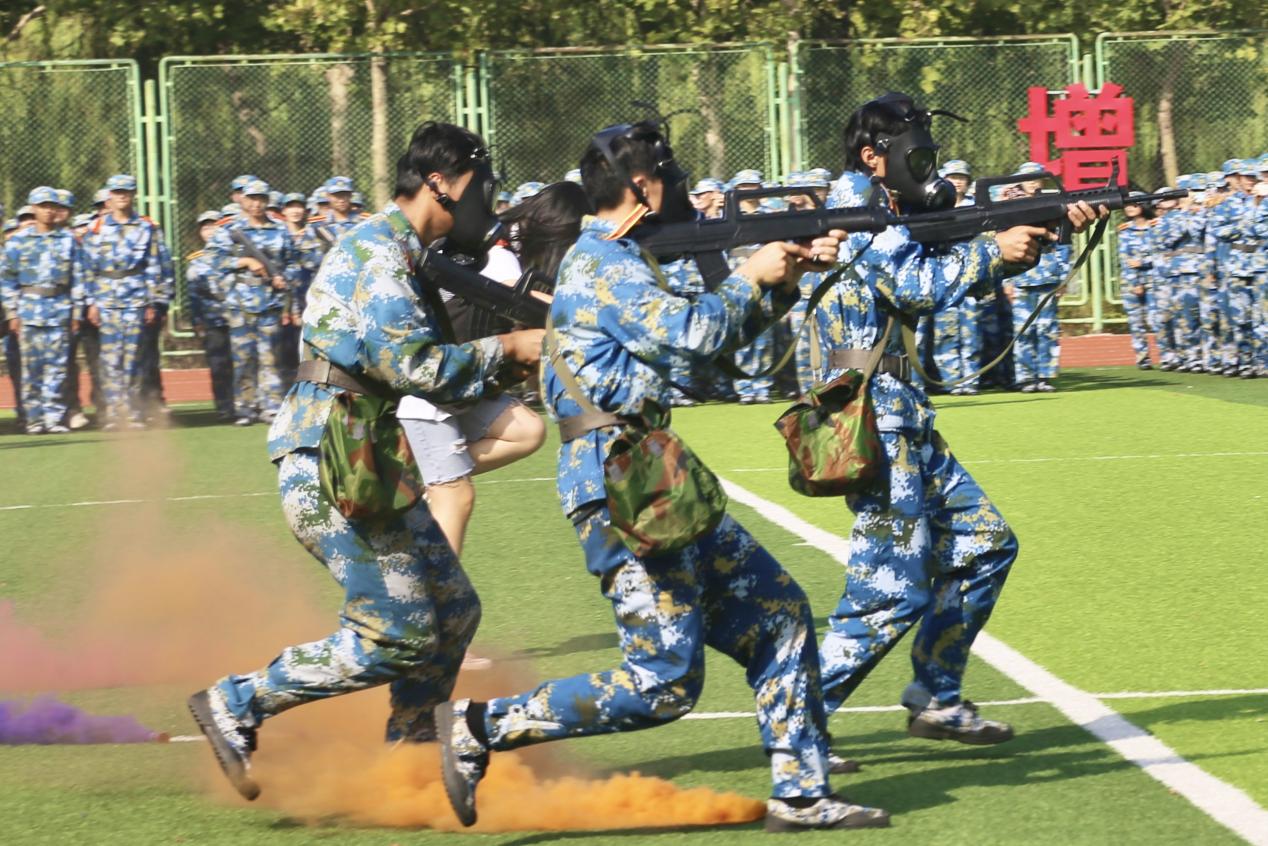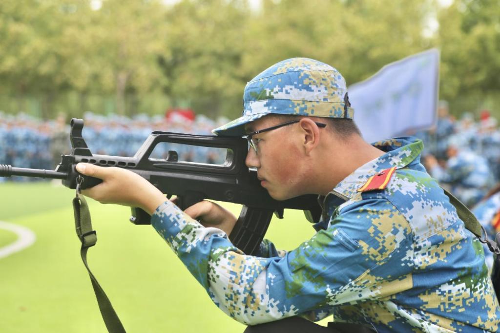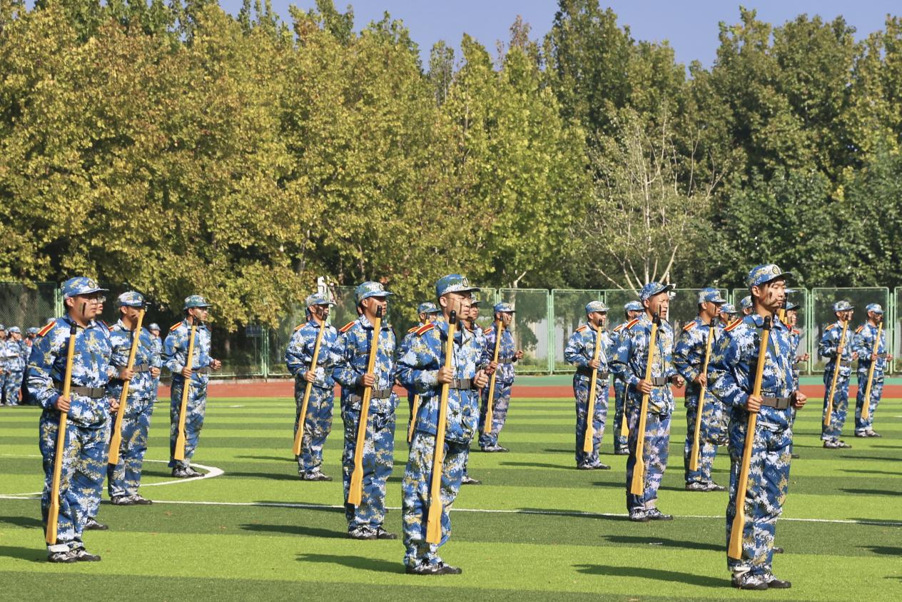 我院学子在特色方队中表现优异,眼神坚毅、严阵以待,一招一式尽显蓬勃朝气,完美地进行了军体拳、刺杀操与战术综合的演练。