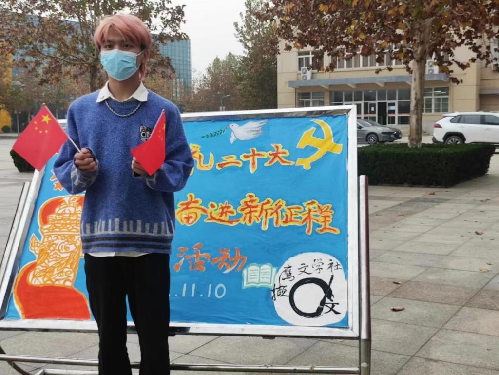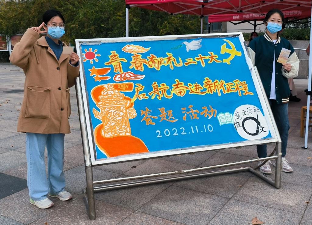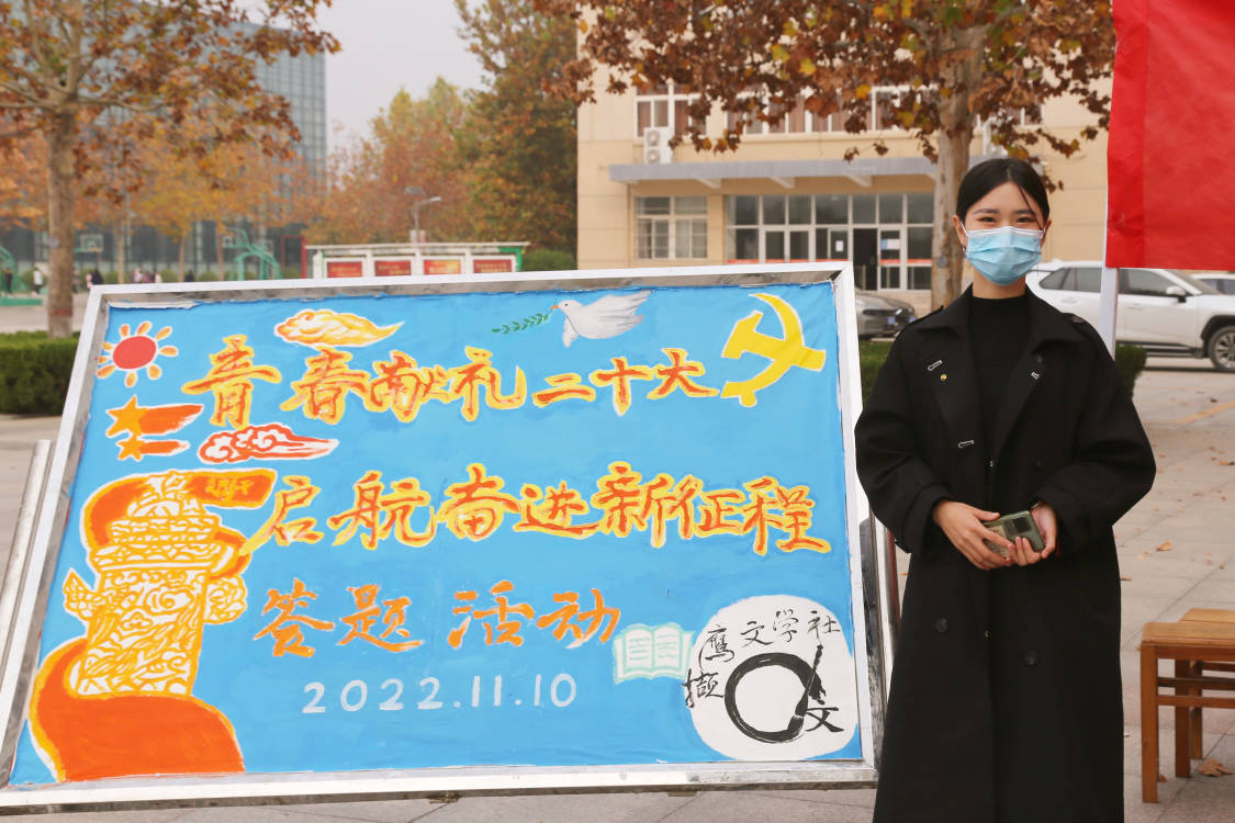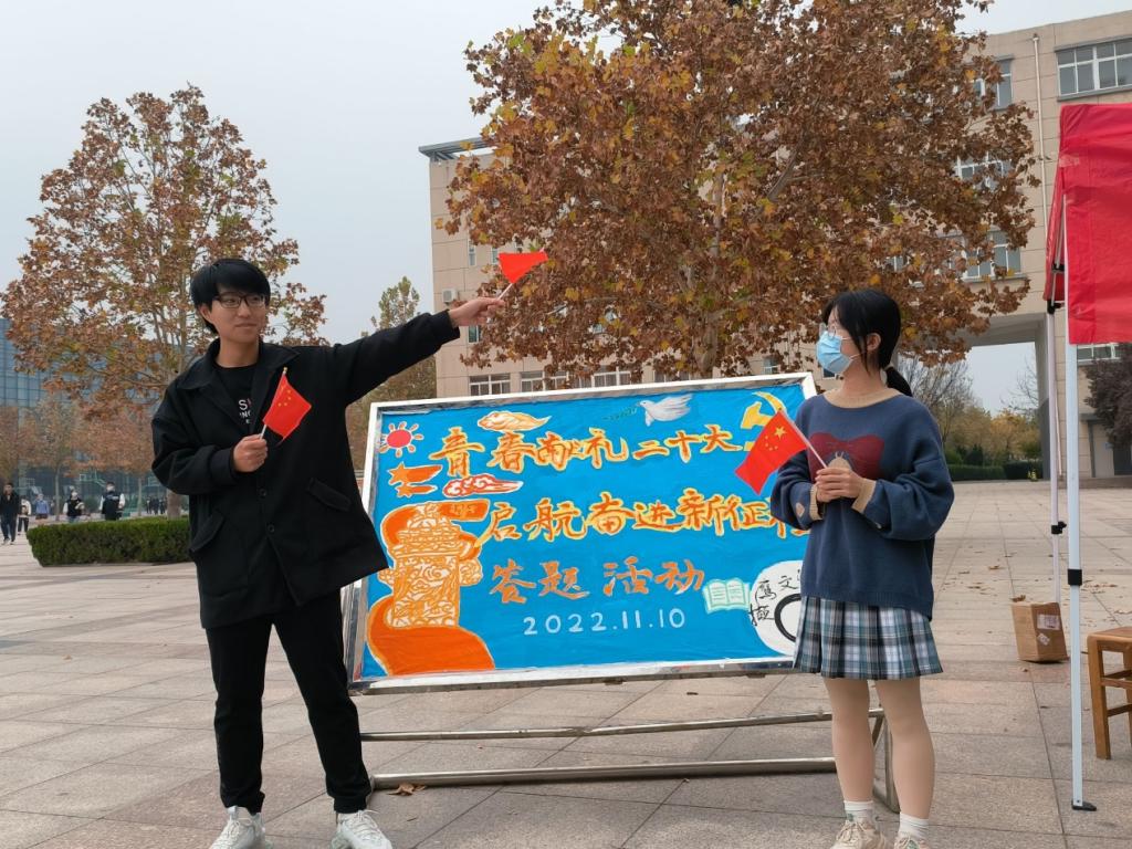 11月10日,由校团委主办、经济管理学院撷鹰文学社承办的“青春献礼二十大,启航奋进新征程”答题活动在齐河校区二号教学楼北侧开展,本次活动旨在弘扬优秀传统文化,同时推动党的二十大精神入脑入心,激励和引导青年学子不忘初心、牢记使命、锐意进取、砥砺前行。