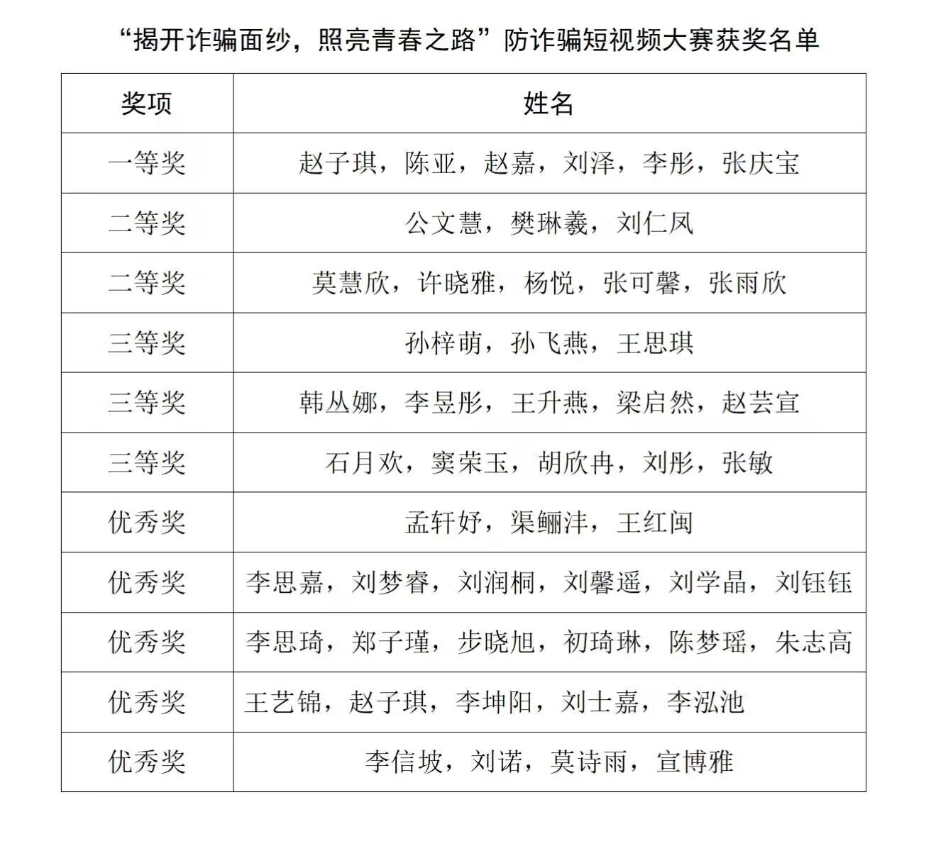 此次大赛通过短视频的形式,向大家传递了防诈的重要性,同学们创作的反诈短视频作品类型丰富、形式新颖,内容充实,具有良好的反诈宣传效果。经过对参赛作品立意表达、创作形式、宣传效果等进行综合评审,评选出十一组获奖作品。