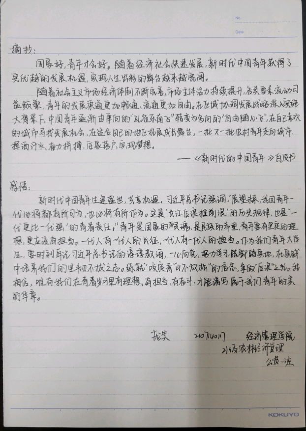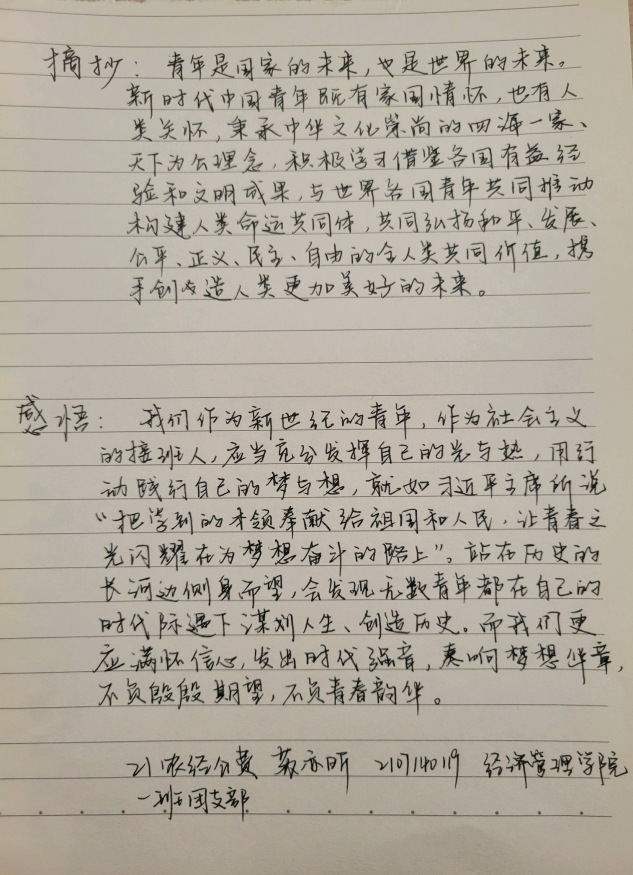 2021级农林经济管理公费一班团支部开展了习近平总书记有关重要论著和系列著作专题学习会。首先介绍了《新时代的中国青年》是一部记录新时代中国青年发展事业成果、反映新时代中国青年精神风貌的重要文献。同学们通过自行阅读,小组讨论,进一步体会党对青年的殷切期望。赵望舒同学表示,作为新时代的中国青年,我们更应开拓创新,勇立潮头,为中华民族伟大复兴奉献自己的力量。