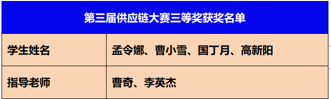 物流教研室精心组织了校内选拔赛,有116名同学参加校内选拔,最终选出了孟令娜、曹小雪、国丁月、高新阳4位同学参加国赛,在曹奇老师和李英杰老师的精心指导下,4位同学历经初赛、复赛和线上直播决赛获得了三等奖。