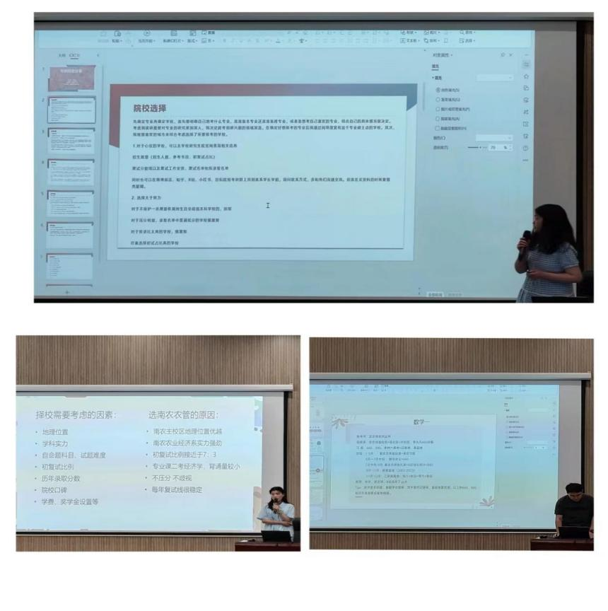 张雨亭学姐从大家比较关注的择校问题出发,建议大家不要盲目择校,并建议大家认真梳理知识点与制定计划,给自己留出足够的复习时间,让同学们对考研过程准备有了更充分的了解。而吴京霞学姐对择校问题进行了更加详细的解释,指出“选择和努力很重要,但选择大于努力”,她充分列举了择校需要考虑的因素,让同学们对择校有了更清晰的认识。朱坤鹏学长则强调了学习要先从自己最薄弱的地方下手,同时兼顾好专业课的学习,找到自己的学习节奏,不要被周围的环境所影响。
