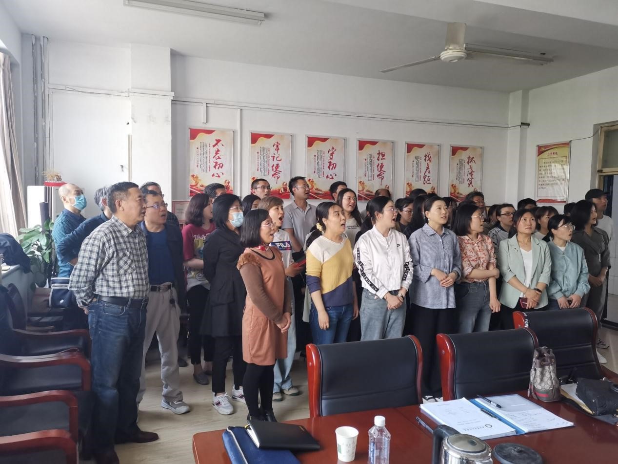 “五星红旗迎风飘扬,胜利歌声多么嘹亮,歌唱我们亲爱的祖国,从今走向繁荣富强……”,5月6日下午,为丰富党史学习教育内容,我院在济南校区1号教学楼党建活动室组织全体教师齐唱红歌颂党恩。