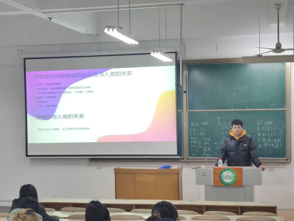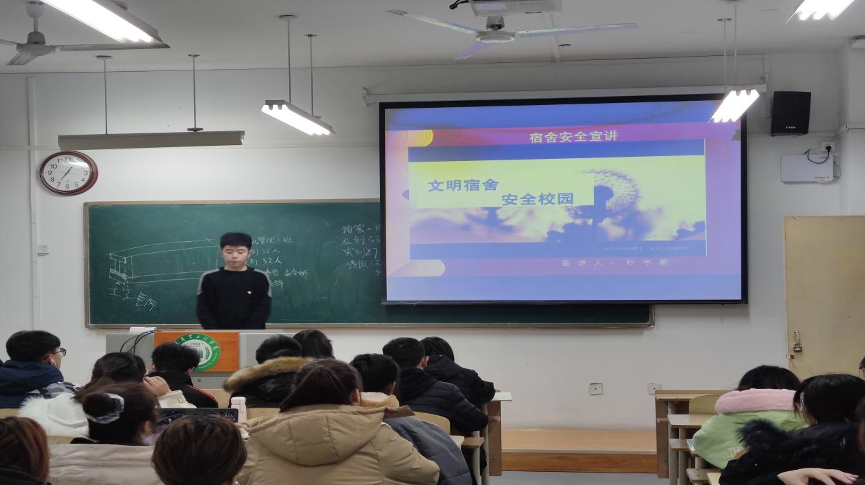 宣讲主要从两个方面进行,首先从宿舍卫生安全的角度向大家阐述了关于预防冬春季节流感的相关知识。冬春季节本就是流感等病情的高发期,而病菌易附着于灰尘停留在室内,因此鼓励大家做到勤通风,养成良好的宿舍卫生习惯。其次说明了关于宿舍消防安全的问题。在宿舍内使用大功率电器易造成火灾、电路损坏等问题,造成极大危害。希望同学们不要使用吹风机等违规电器,以免造成严重后果。