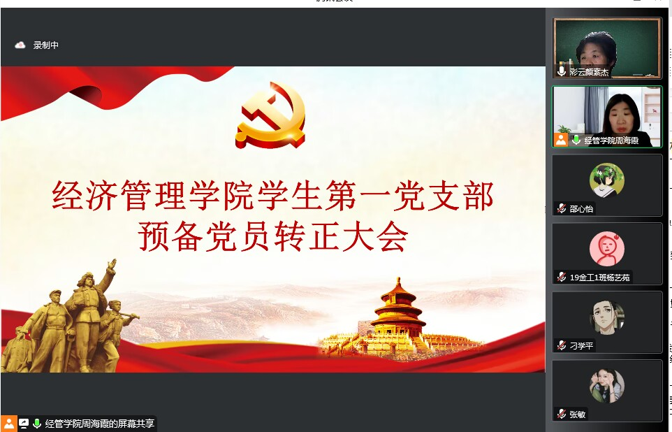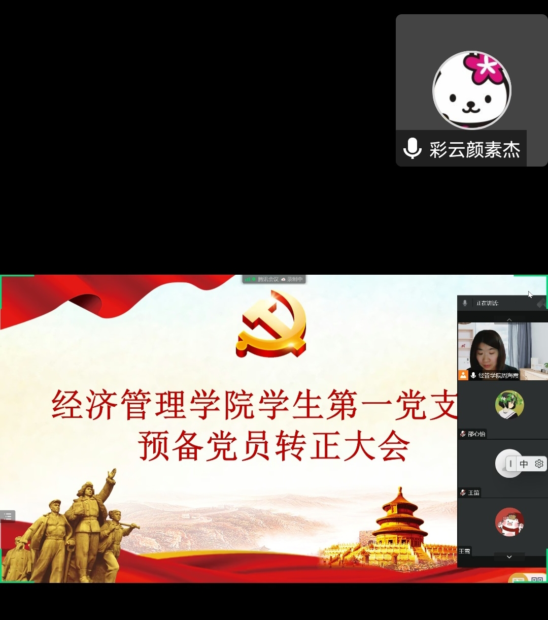 12月29日晚上,经济管理学院学生第一党支部利用腾讯会议举行预备党员转正大会。会议由学生第一党支部书记周海霞主持。学院党总支书记颜素杰、全体党员参加了会议。