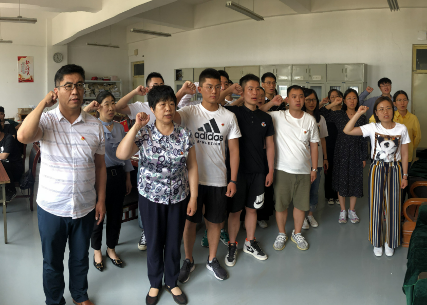 辅导员王硕珍带领全体党员重温了入党誓词。在鲜红的党旗下,全体党员举起右手、握紧拳头,庄严宣誓。党们员重温最初入党宣誓时的庄严承诺和坚定决心,在党旗下接受心灵的净化和洗礼,铭记共产党员的政治责任和历史使命。