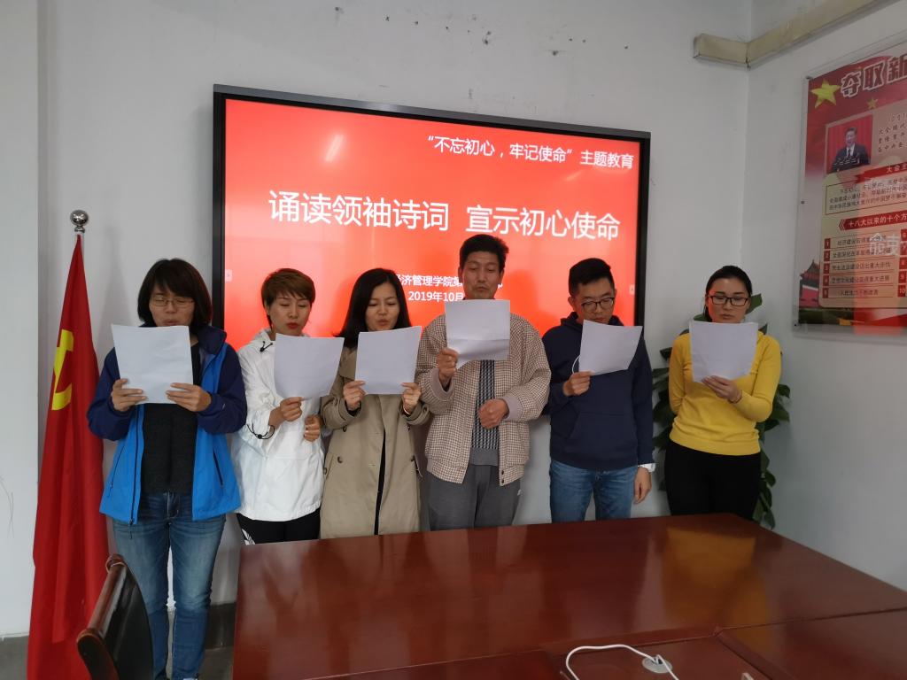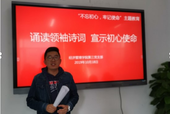 “ 孩儿立志出乡关,学不成名誓不还。埋骨何须桑梓地,人生无处不青山。”一声声饱含感情的诵读,一句句铿锵有力的声音,久久回荡在党建活动室。10月18日下午,为重温红色经典,引导支部党员不忘初心,坚定爱国情怀和政治信仰,经管学院教工第三党支部在党建活动室组织开展了“不忘初心、牢记使命”红色经典诵读主题党日活动。