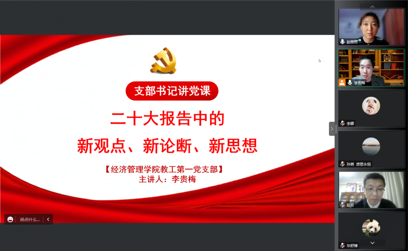 2022年12月6日经济管理学院教工第一党支部开展“支部书记讲党课”主题党日活动,党支部书记李贵梅主持会议,教工第一党支部全体党员参加会议。