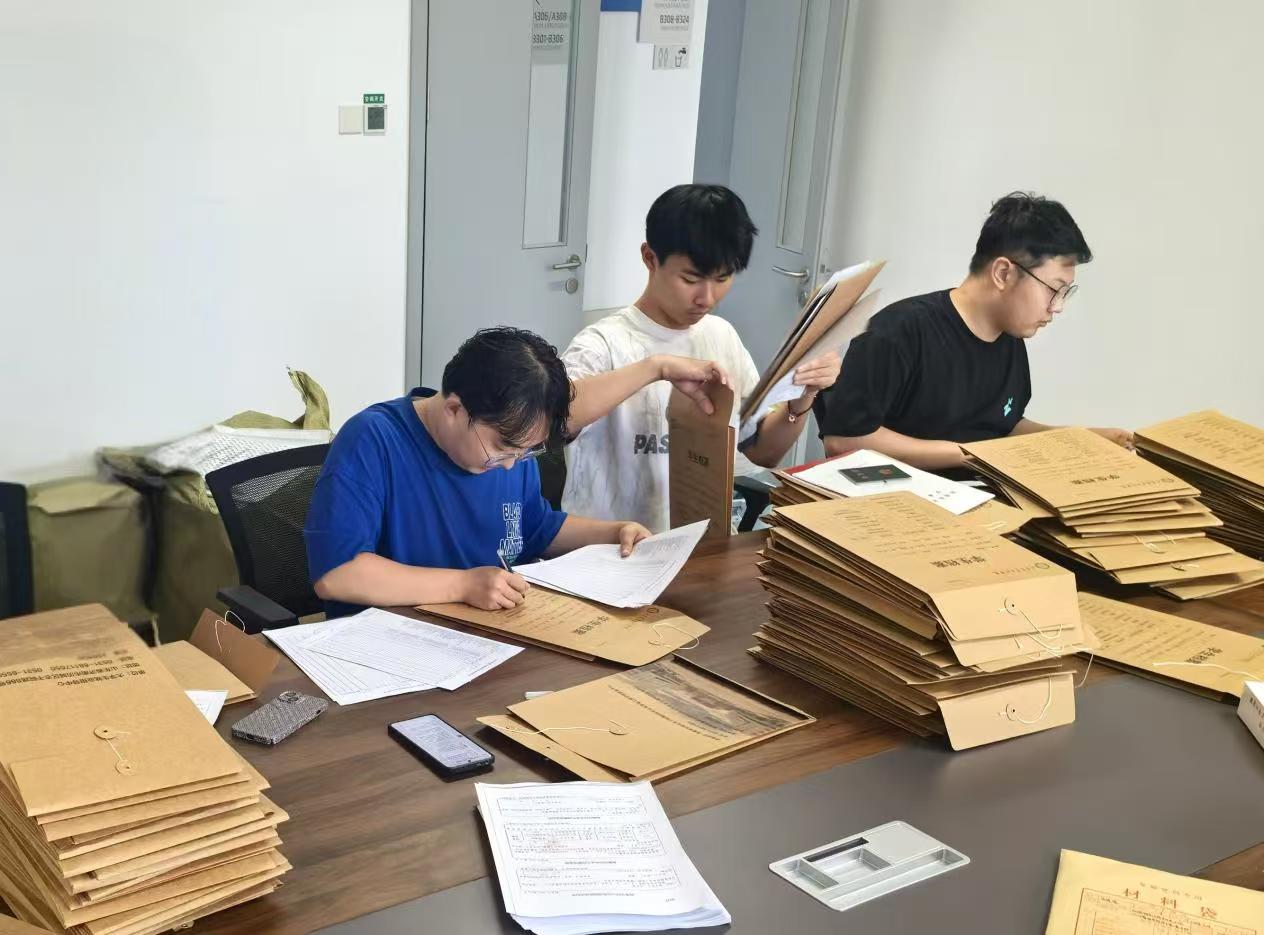 志愿者们对照清单仔细核查档案,确保材料无误、齐全。接着,他们按流程贴好封条、盖好印章,逐份贴上快递单、写下编号。整个过程中,大家态度认真,细心严谨,每一步都做得细致规范,全力保障档案顺利寄送。