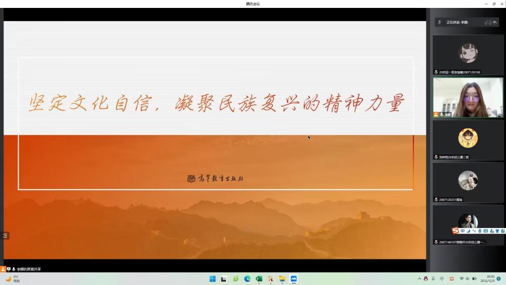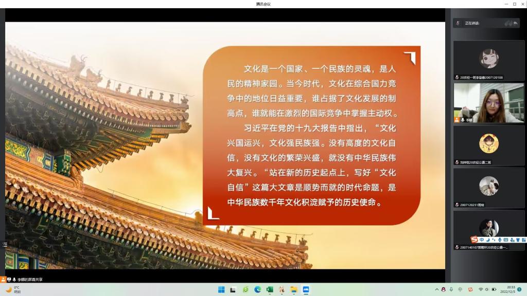 2022年11月29日,经济管理学院党总支书记颜素杰通过腾讯会议为20级金融工程专业、经管专业、物管专业213名同学做《党的二十大精神解读》,政治辅导员王太然通过腾讯会议为20级物流工程专业65名同学宣讲了党的二十大精神,政治辅导员李娜通过腾讯会议为20级农林经济管理专业70名同学作了题为“坚定文化自信,凝聚民族复兴的精神力量”的报告。